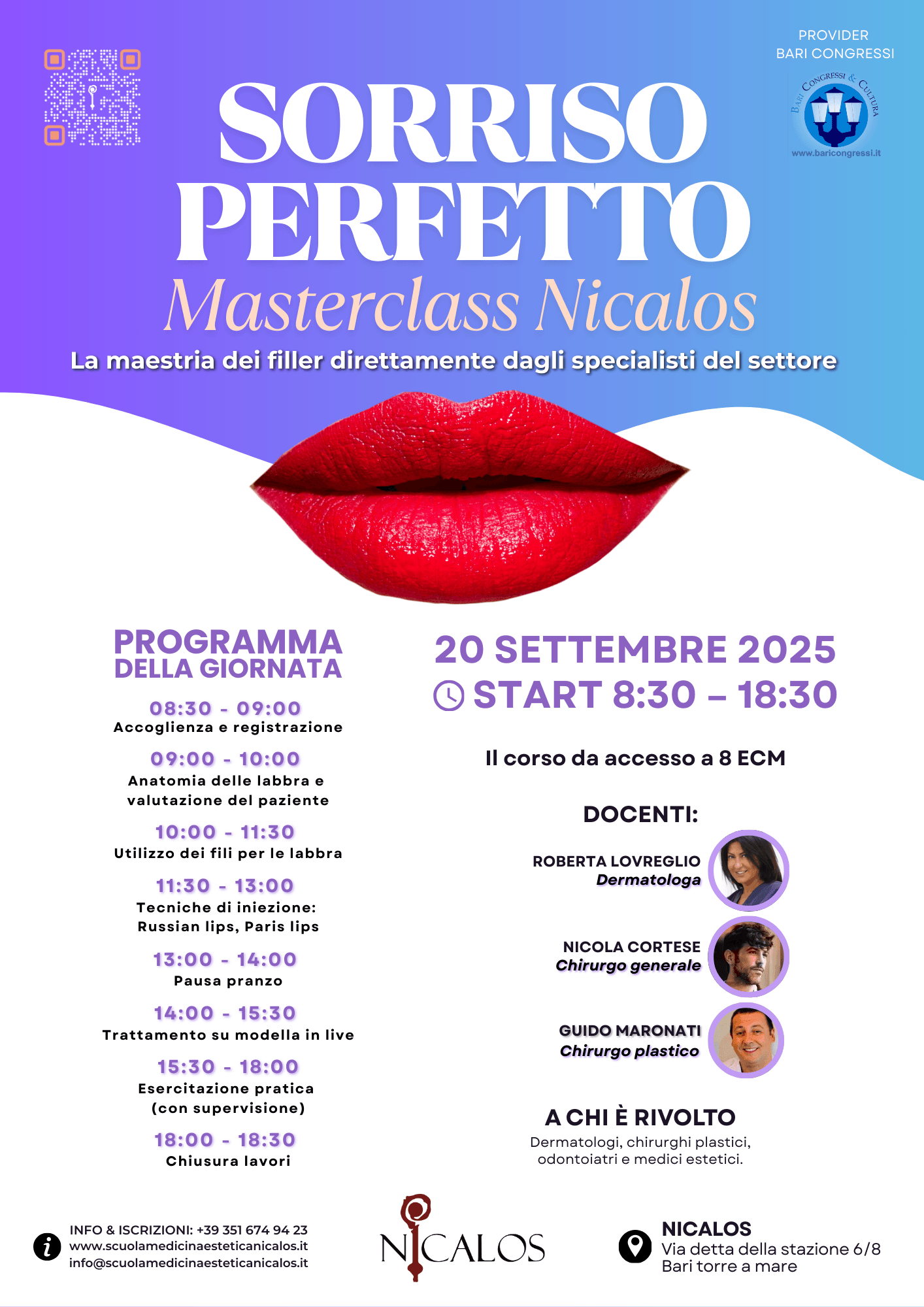 La master class "Sorriso perfetto - "La maestria dei filler direttamente dagli specialisti del settore" del 20 settembre 2025, organizzata dalla Scuola di medicina estetica Nicalos a Bari, è un corso intensivo per medici e odontoiatri che vogliono perfezionare tecniche avanzate di trattamento labiale.